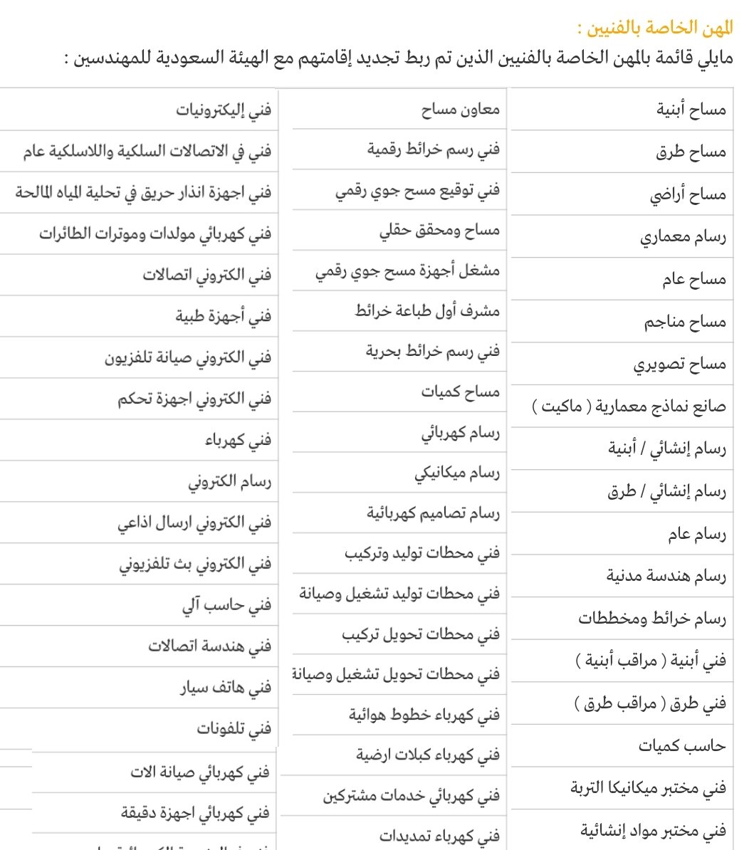 خدماتي الإلكترونية Auf Twitter ماهي المهن الخاصة بالفنيين الذين تم ربط تحديد اقاماتهم مع الهيئة السعودية للمهندسين مايلي قائمة بالمهن الخاصة بالفنيين الذين تم ربط تجديد إقامتهم مع الهيئة السعودية للمهندسين