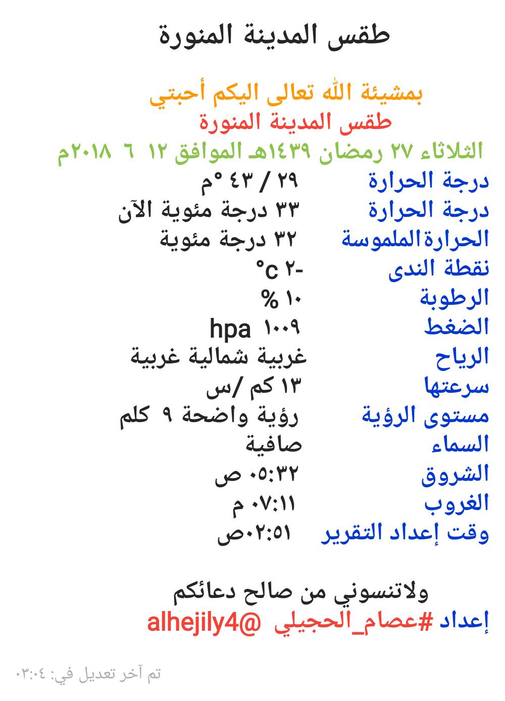 عصام الحجيلي V Twitter صباح الخير طقس المدينة المنورة الان الثلاثاء ٢٧ رمضان ١٤٣٩ الموافق ١٢ يونيو ٢٠١٨ اللهم إنك عفو تحب العفو فاعف عنا اللهم صل وسلم على نبينا محمدﷺ عصام الحجيلي Alhejily4 Https T Co Oasvgtw54d