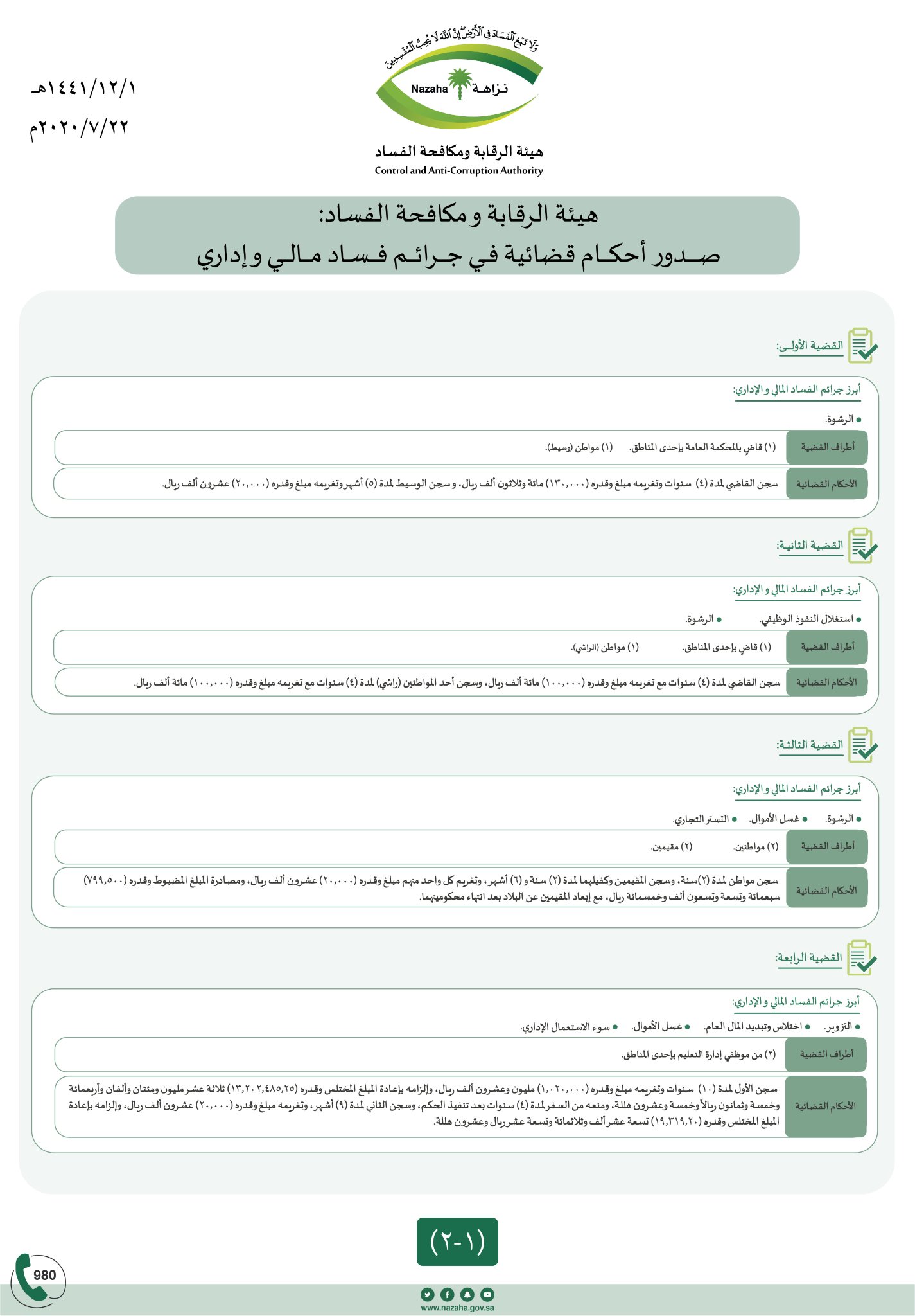 صحيفة تواصل هيئة الرقابة ومكافحة الفساد صدور أحكام قضائية في عدة جرائم فساد مالي السعودية المملكة نزاهة عاجل